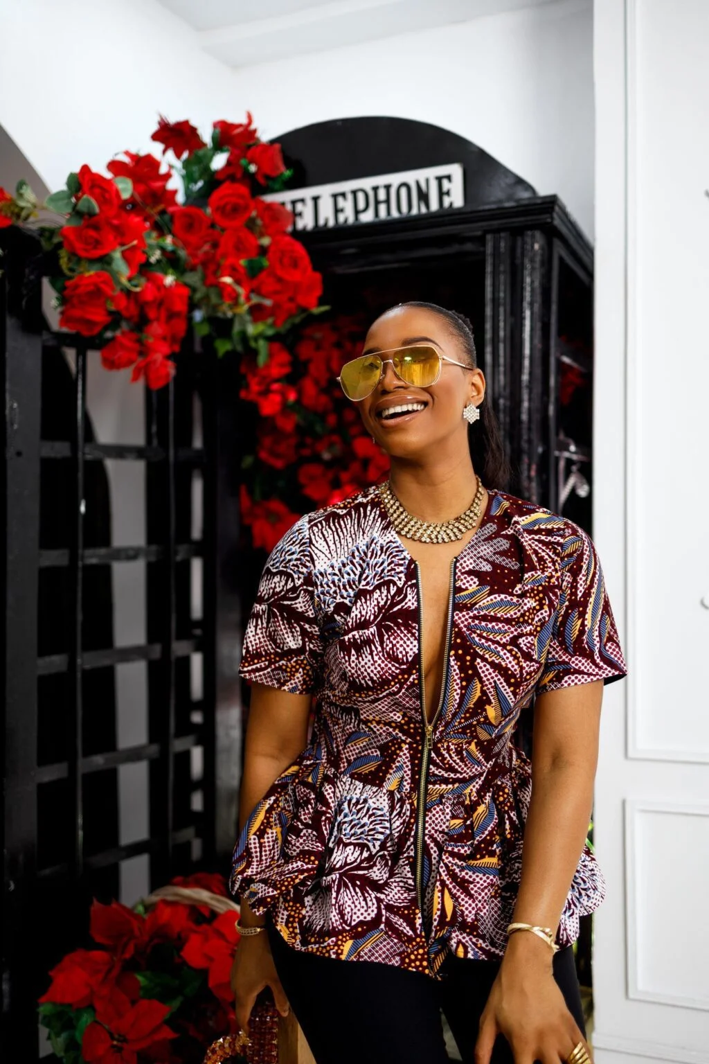 Elevate your wardrobe with the DUNNI African Print Front Zip Peplum Top. Its vibrant print, lined fabric, and chic peplum design will have you turning heads. Show off your boss style and step up your fashion game with this must-have top. Zip up and get ready for all the compliments.