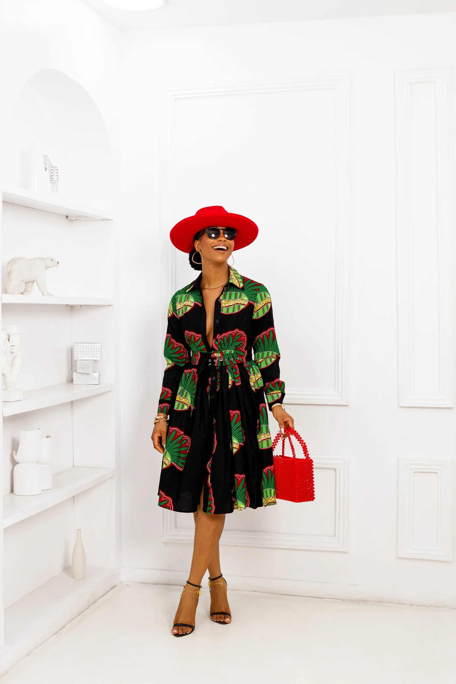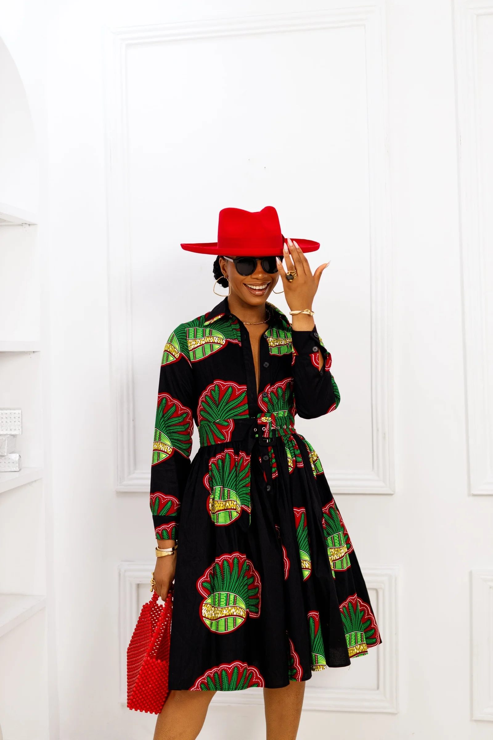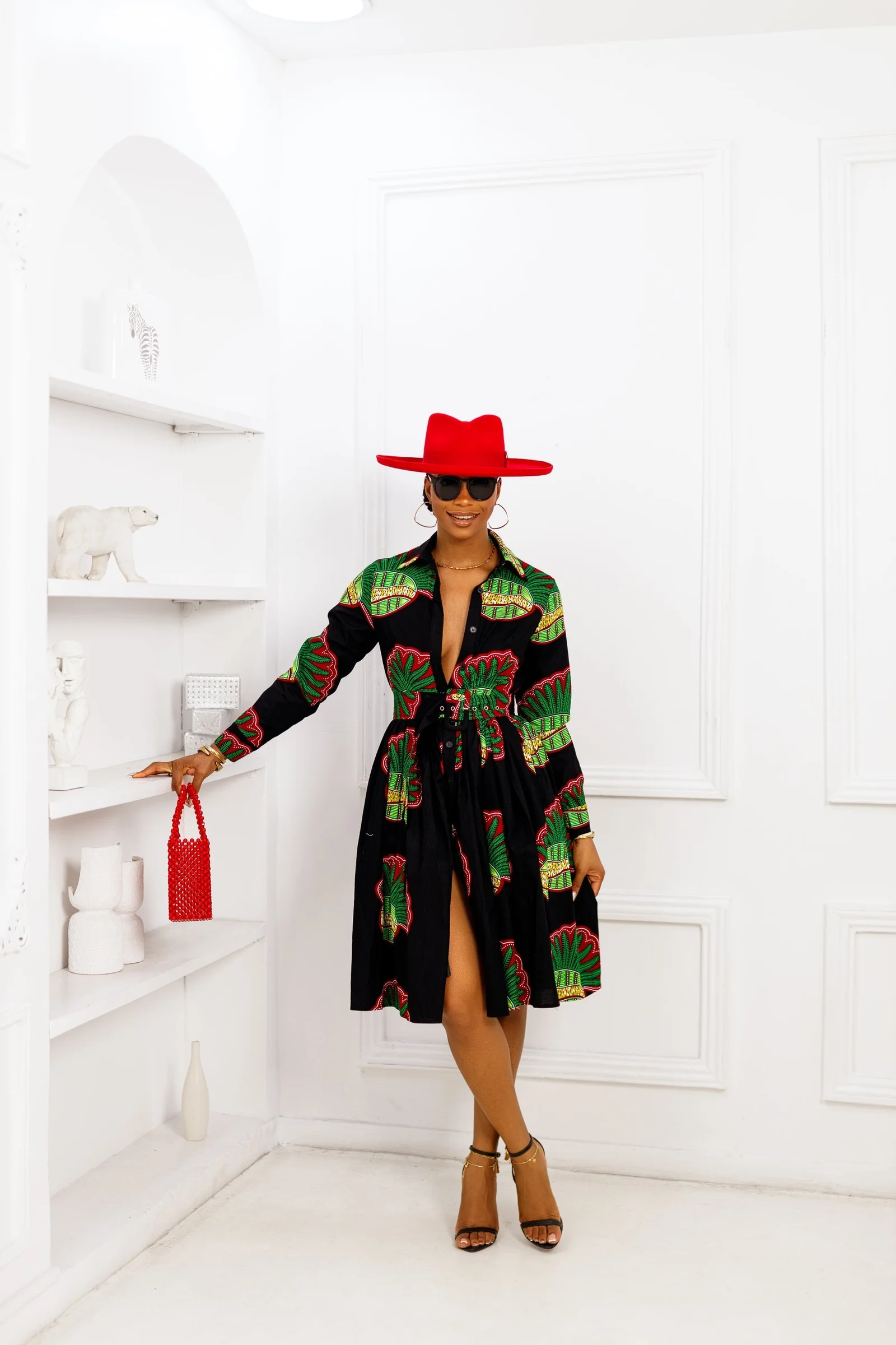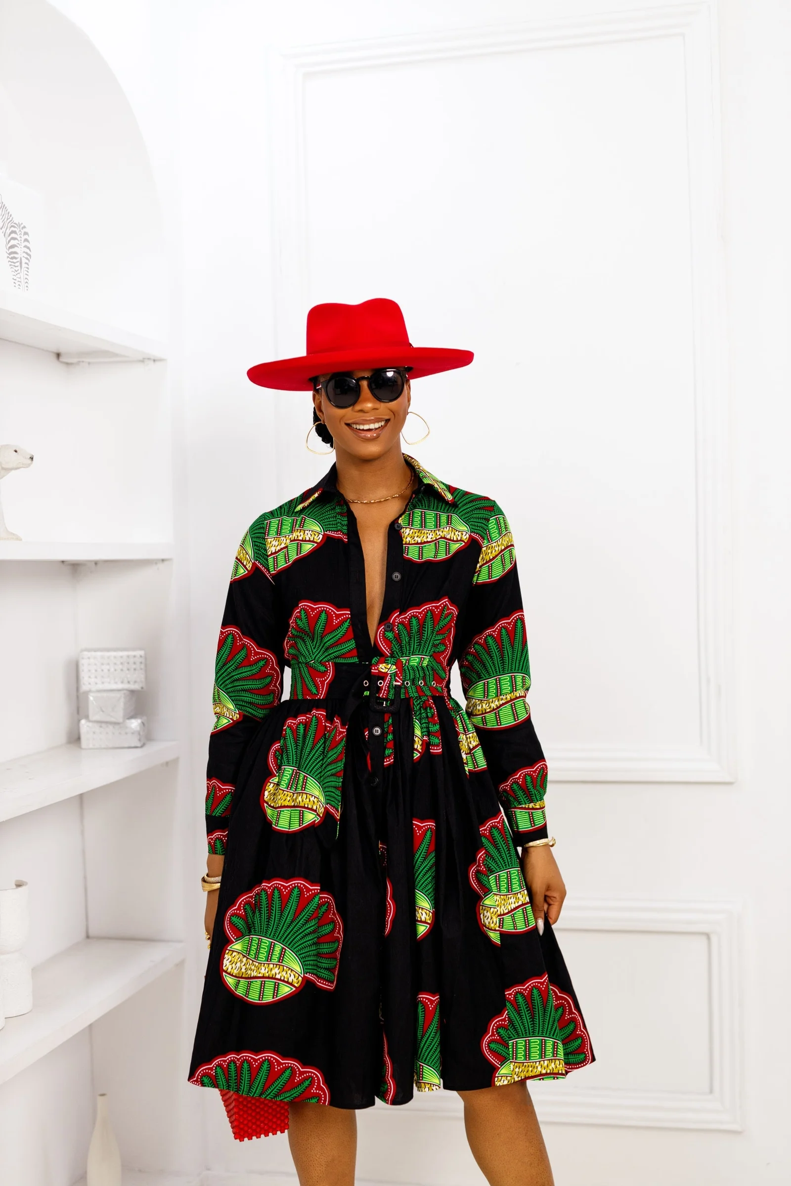 Experience bold and vibrant style with the ELIZABETH African print shirt dress. Its fully lined design includes a collar neckline, long sleeves, and a detachable belt for a versatile look. Complete with a button down fastening, this dress is ready to make a statement wherever you go!