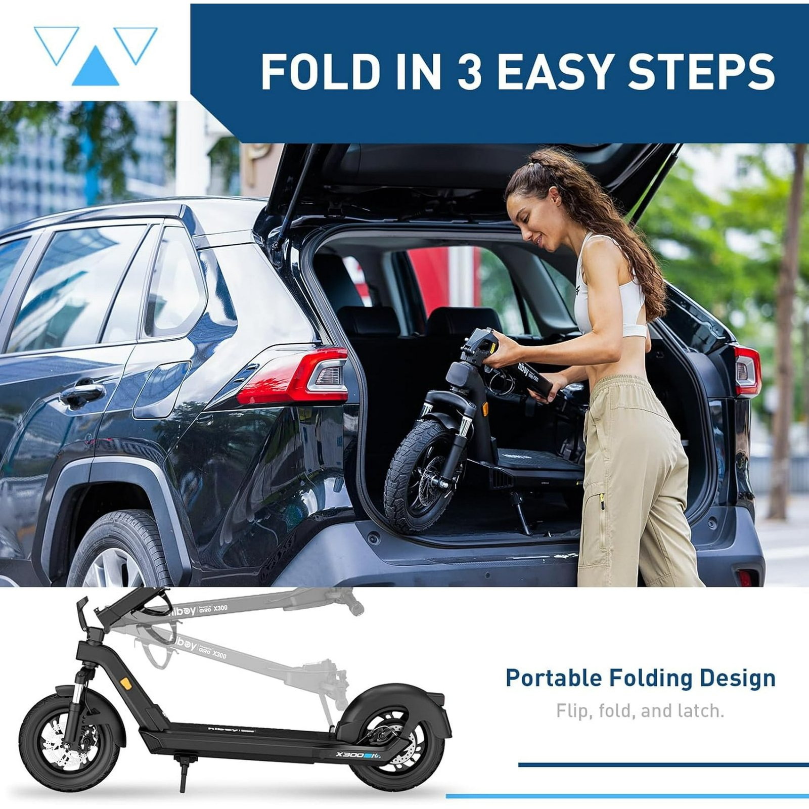 - Unleash the Power of Big Wheels – The X300 e-scooter adopts a Hydraulic shock absorber front fork and 12-inch pneumatic tires, which means you can enjoy a smoother and more comfortable riding experience, even on bumpy roads!