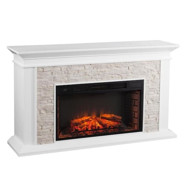 Western romanticism warms to life in this striking electric fireplace. Crisp white finish, subtle woodwork and rustic white simulated stacked stone encases the firebox. Extra wide fireplace ignites the senses; cozy heat fills great rooms and reading nooks alike, wowing any crowd. Conjure the ambience of a blazing hearth in an entertaining parlor, living room or dining area with this stunning, traditional fireplace. Energy efficient LED bulbs light the fire, a cost effective way to ignite bliss in any room without professional installation. User friendly remote control offers 4-way adjustability to customize the widescreen fireplace from the comfort of your sofa. Flames and logs harmonize with 5-level adjustment, plus optional down light illumination. An automatic shutoff and glass that remains cool to the touch ensure the fireplace warms safely. Turn off the heat to enjoy the fireplace ambience year round.