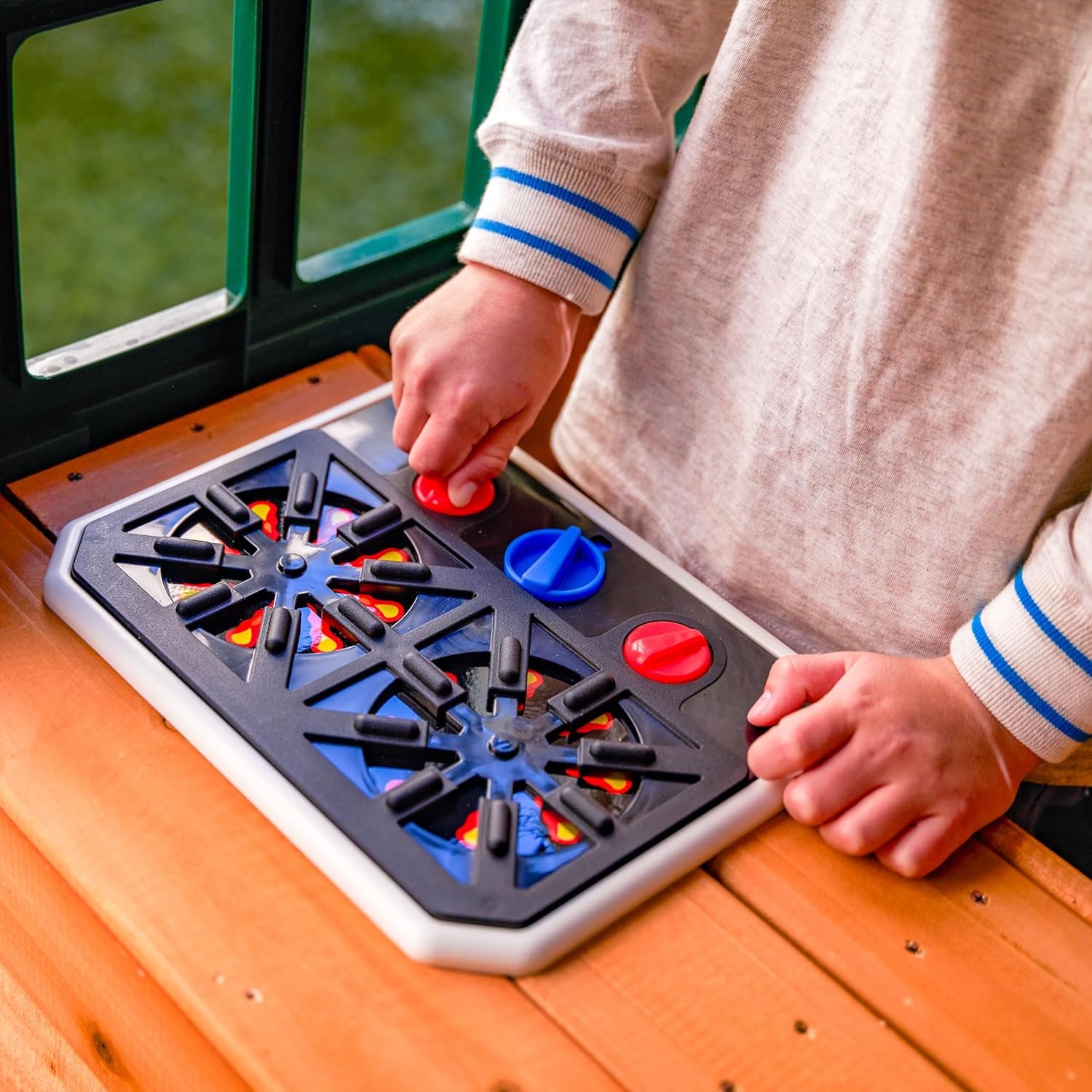 - Twist N’ Ride tube slide and two high-rail wave slides, play clock and double-sided chalkboard