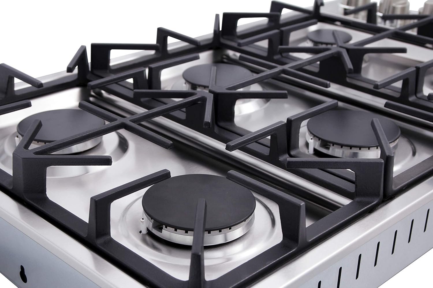• Continuous Cast Iron Grates – Heavy-duty, edge-to-edge, porcelain-coated cast iron grates allow for easy movement of pans between burners.